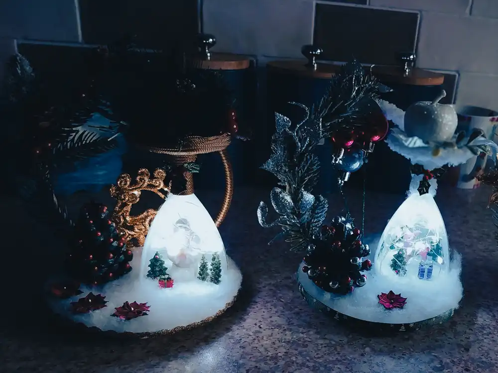 Alongside the jars, Caroline also made acrylic Christmas orbs (bell-shaped domes) with LED lights inside. These are standout pieces because they create a full miniature scene under a clear acrylic cover. They also look beautiful in daylight and even more magical once lit.