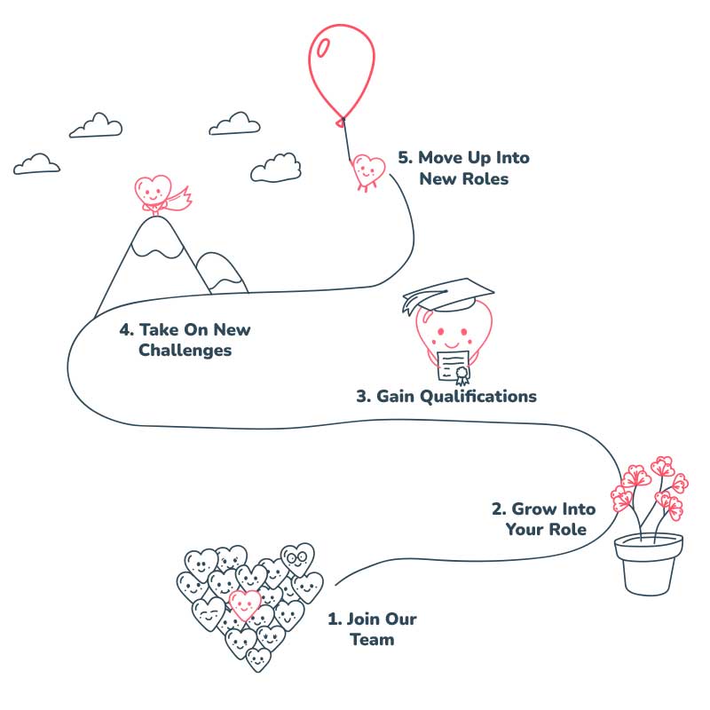 When you join our team, we invest in your growth and development. We support you throughout your training and guide you based on ongoing feedback from clients and colleagues. As a valued member, you can become a “Champion” and specialise in a specific area to deepen your knowledge and share your expertise. We prioritise internal recruitment for new positions, allowing you to discuss career aspirations and explore advancement opportunities within our organisation. We are committed to supporting your career goals and providing the best courses and programs to help you reach your desired destination. We value your ideas and consider every team member a key player, fostering teamwork and collaboration. If you are caring and compassionate, we would love to hear from you.